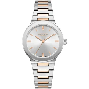 Rafinat si modern, acest ceas Lee Cooper London imbina perfect stilul clasic cu accentele contemporane. Cadranul argintiu si bratara bicolora din otel inoxidabil creeaza un accesoriu elegant si versatil.
